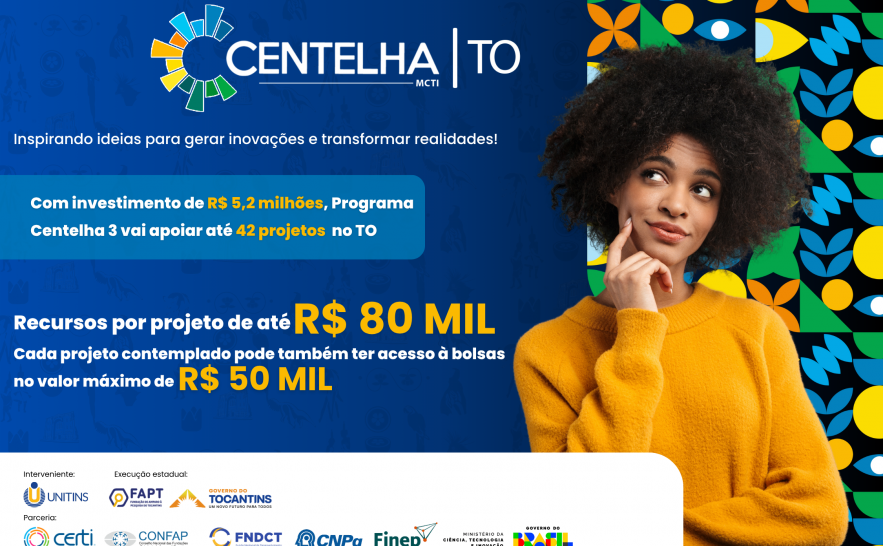 O Governo do Tocantins, por meio da Fundação de Amparo à Pesquisa do Tocantins (Fapt), publicou nesta quarta-feira, 12, o edital do Programa Centelha 3 Tocantins, iniciativa que oferece recursos financeiros, capacitação e acompanhamento técnico para transformar ideias inovadoras em negócios. Confira aqui o edital.