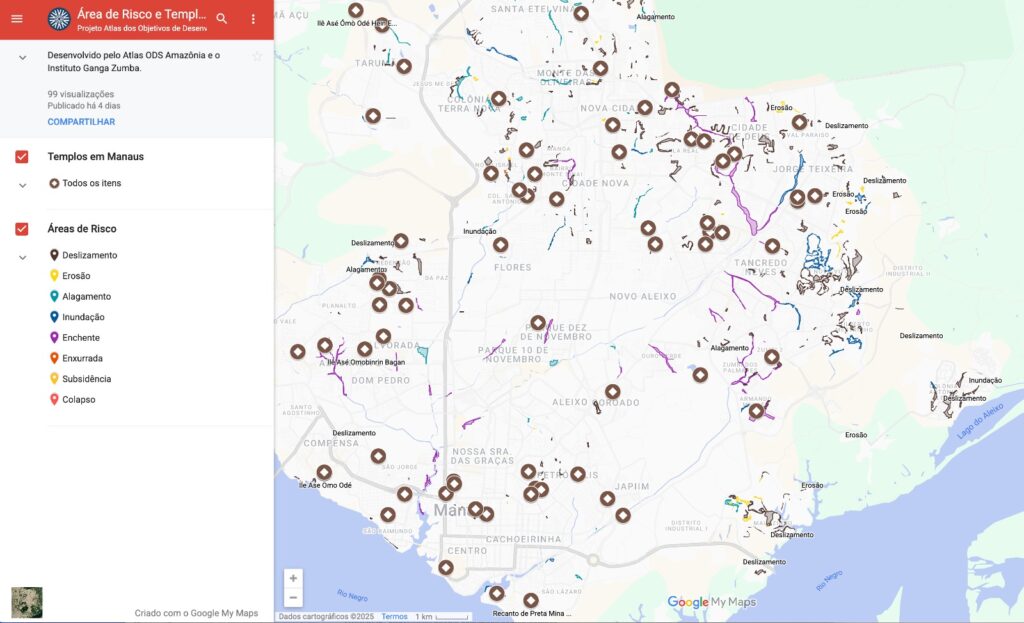 Paralelamente, com a ajuda do levantamento realizado pelo Atlas ODS Amazônia e o Instituto Ganga Zumba, foi elaborado um mapa que sobrepõe os pontos dos terreiros/templos e as áreas de risco geológico identificadas.
