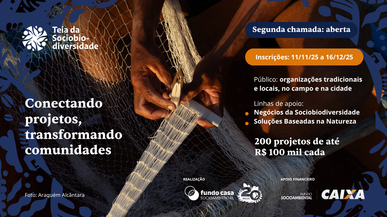 Estão abertas, até 16 de dezembro, as inscrições de projetos na segunda chamada da Teia da Sociobiodiversidade. Serão selecionadas, pelo menos, 200 propostas com apoio de até R$ 100 mil cada, voltados à promoção do desenvolvimento sustentável de comunidades tradicionais e locais, no campo e nas cidades.